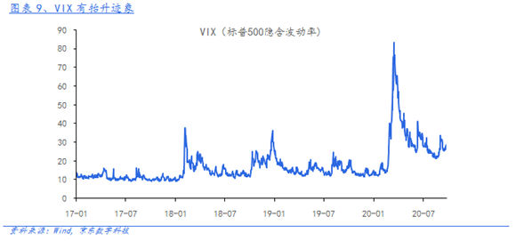 4)大選臨近,不確定性抬升壓制風(fēng)險(xiǎn)偏好。距離大選還剩最后1個(gè)月,民調(diào)情況仍較為焦灼,在關(guān)鍵州民調(diào)差距保持在4個(gè)點(diǎn)之內(nèi)。特朗普一再表態(tài)"如果敗選,不一定能接受選舉結(jié)果",進(jìn)一步增添了政治動(dòng)蕩風(fēng)險(xiǎn)??肆诸D任命的最高法院大法官金斯伯格離世后,特朗普迫不及待提名新任人選,而此前其以提名了9名大法官中的2名。兩黨就此展開激烈交鋒,令人不由聯(lián)想2000年小布什和戈?duì)柕母?jìng)選中對(duì)投票結(jié)果爭(zhēng)議的一幕,那次爭(zhēng)議最終由最高法院判決才塵埃落定。大選臨近,不確定性抬升在市場(chǎng)上開始顯現(xiàn),標(biāo)普500隱含波動(dòng)率逐步走高,壓制市場(chǎng)的風(fēng)險(xiǎn)偏好。