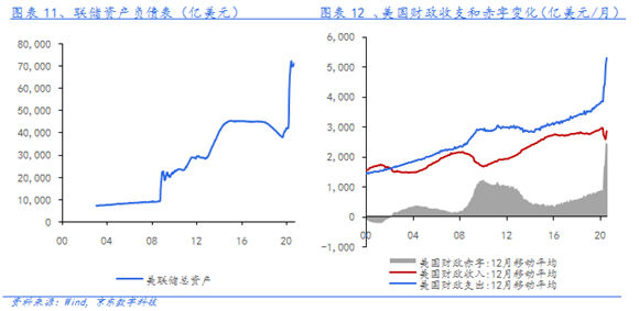 貨幣數(shù)量寬松面臨財(cái)政赤字的制約。08年金融危機(jī)后,美國(guó)開始量化寬松,買入資產(chǎn)投放貨幣。疫情危機(jī),美聯(lián)儲(chǔ)在2季度大量購(gòu)買國(guó)債和MBS資產(chǎn),總資產(chǎn)由4萬億美元擴(kuò)張到7萬億美元。在配合財(cái)政部發(fā)債步伐、主動(dòng)管理實(shí)體部門信貸支持的中長(zhǎng)期工具使用方面,美聯(lián)儲(chǔ)展現(xiàn)出不遺余力呵護(hù)市場(chǎng)環(huán)境、托底經(jīng)濟(jì)的態(tài)度,理論上其具有無限QE的可能。不過,3季度美聯(lián)儲(chǔ)的擴(kuò)表步伐明顯放緩。隨著大選即將落定,美聯(lián)儲(chǔ)既沒有國(guó)債資產(chǎn)支撐,也沒有意愿去繼續(xù)大規(guī)模擴(kuò)表。