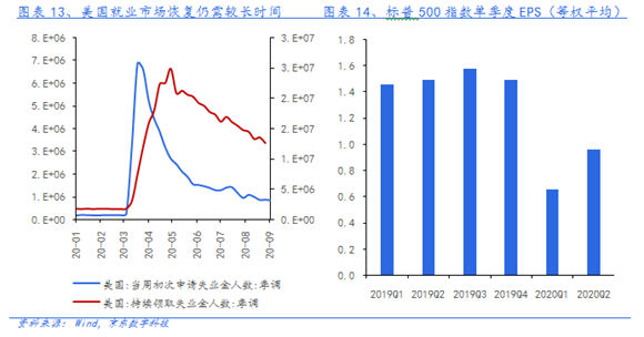 2)美國(guó)勞動(dòng)生產(chǎn)率提升遲緩,經(jīng)濟(jì)復(fù)蘇緩慢,企業(yè)盈利改善有限。筆者曾在2014年《美國(guó)經(jīng)濟(jì)步入格林斯潘式復(fù)蘇》一文中指出"美國(guó)人均產(chǎn)出的增長(zhǎng)率大大低于歷史平均水平……基礎(chǔ)設(shè)施落后……美國(guó)經(jīng)濟(jì)還不具備進(jìn)入一個(gè)新的繁榮周期的條件".遲緩的勞動(dòng)生產(chǎn)率增速制約了當(dāng)前經(jīng)濟(jì)復(fù)蘇和企業(yè)盈利的修復(fù)。8月底以來,美國(guó)初請(qǐng)失業(yè)金人數(shù)基本持平在88萬人附近,遠(yuǎn)高于疫情之前;而續(xù)請(qǐng)失業(yè)金人數(shù)更是在千萬級(jí)之上持續(xù)數(shù)月、去化緩慢。美國(guó)失業(yè)率仍處于8%以上的歷史高位,未來需要較長(zhǎng)時(shí)間恢復(fù)。美國(guó)疫情控制不利,爆發(fā)以來從未有效降低,反而一再創(chuàng)出新高,也嚴(yán)重影響了各行業(yè)經(jīng)營(yíng)和消費(fèi)意愿。從企業(yè)盈利來看,二季度標(biāo)普500指數(shù)平均EPS較一季度明顯回升,但仍大幅低于19年同期水平。