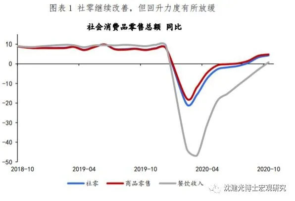 10月經(jīng)濟(jì)數(shù)據(jù)顯示,社零、固定資產(chǎn)投資穩(wěn)步恢復(fù),工業(yè)、服務(wù)業(yè)生產(chǎn)較為強(qiáng)勁,供需兩端帶動中國經(jīng)濟(jì)延續(xù)復(fù)蘇勢頭。接下來,居民消費以及出口-制造業(yè)投資鏈條或在經(jīng)濟(jì)復(fù)蘇過程中扮演更重要的角色。我們預(yù)計,四季度中國GDP增速有望超過6%,全年GDP增速或位于2%-2.5%之間。