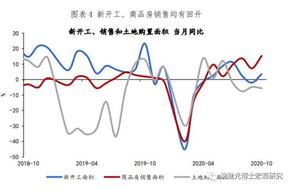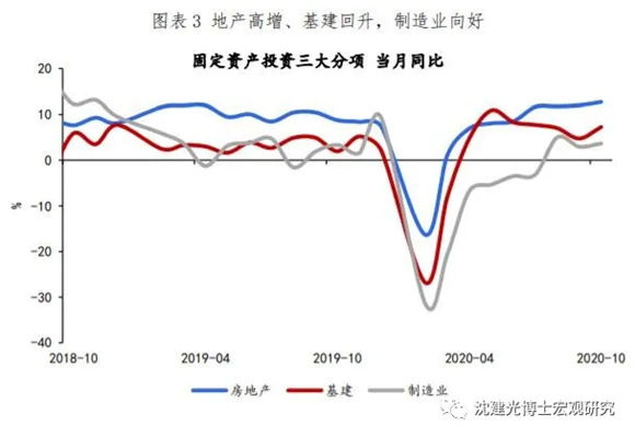 地產(chǎn)高增、基建回升,制造業(yè)持續(xù)向好。房地產(chǎn)投資當(dāng)月同比維持12.7%的高增長,其中商品房銷售、新開工均有回升;竣工面積大幅反彈(關(guān)注其對地產(chǎn)類消費的影響)。這反映出融資政策收緊之下,房企正在加快推盤、施工?;ㄍ顿Y當(dāng)月同比升至7.3%,結(jié)束了連續(xù)四個月的下滑,公用事業(yè)、水利環(huán)境業(yè)增速回升。但10月財政存款的增加顯示出資金使用效率不足,后續(xù)或拖累基建增速。制造業(yè)投資當(dāng)月同比3.7%,實現(xiàn)連續(xù)三個月正增長,企業(yè)利潤反彈、信貸支持力度加大以及高技術(shù)行業(yè)快速恢復(fù),推動企業(yè)投資意愿的好轉(zhuǎn)。