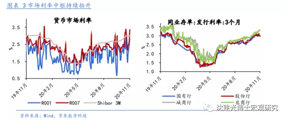 三是6月以來市場利率中樞持續(xù)抬升。上半年央行通過全面降準(zhǔn)、再貼現(xiàn)再貸款等工具向市場投放了大量流動性、資金面極其充裕,R001在四五月份一度降至0.75%左右。6月以來貨幣政策由前期“極度寬松”逐步轉(zhuǎn)向結(jié)構(gòu)性發(fā)力、精準(zhǔn)滴灌,央行一面通過引導(dǎo)金融體系讓利等形式推動降低實(shí)體融資成本,一面在公開市場操作方面趨于謹(jǐn)慎、控制流動性投放。至11月初,市場利率中樞較前期已明顯抬升,R001和R007均升至3%左右、無風(fēng)險(xiǎn)利率10年期國債收益率接近3.3%,同業(yè)存單發(fā)行利率自6月以來也一路上升、目前3個(gè)月品種已升至3%以上。