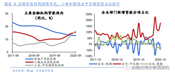 四是金融監(jiān)管趨嚴(yán)、不斷強(qiáng)化實(shí)體導(dǎo)向。疫情爆發(fā)后政策面對小微企業(yè)的信貸支持力度顯著加大,但部分實(shí)體貸款違規(guī)變換資金用途,以多種形式直接或間接(結(jié)構(gòu)性存款、理財(cái)產(chǎn)品等)投向房地產(chǎn);違規(guī)信貸作為首付進(jìn)一步撬動按揭,6-9月全國新增居民中長期貸款均在6000億左右,深圳、寧波等熱點(diǎn)城市房價(jià)上漲迅速。在此情況下,監(jiān)管迅速出臺“三道紅線”規(guī)則并窗口指導(dǎo)部分金融機(jī)構(gòu)收緊房貸額度,旨在遏制金融亂象、降溫房市、減少房地產(chǎn)擠占實(shí)體金融資源。其他監(jiān)管動作也具有一定指示意義,例如,近期央行、銀保監(jiān)會聯(lián)合發(fā)布《網(wǎng)絡(luò)小額貸款業(yè)務(wù)管理暫行辦法(征求意見稿)》,銀行與互聯(lián)網(wǎng)公司合作的聯(lián)合貸款業(yè)務(wù)未來面臨全面壓降,同樣值得關(guān)注。