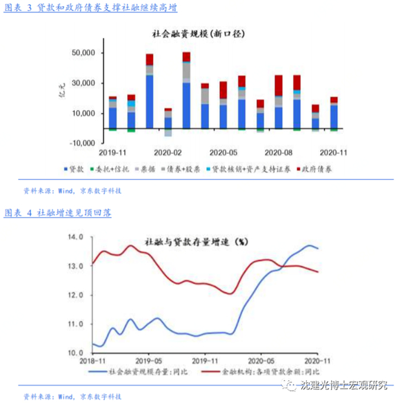 12月9日央行公布了11月社融及信貸數(shù)據(jù)。其中,貸款和社融當(dāng)月分別新增1.43和2.13萬億,同10月相比有明顯回升、總體符合市場預(yù)期。以社融和M2增速衡量,四季度為保障經(jīng)濟(jì)持續(xù)復(fù)蘇,貨幣政策沒有轉(zhuǎn)向、在總量上依然保持著寬松態(tài)勢,結(jié)構(gòu)上強(qiáng)調(diào)精準(zhǔn)滴灌、全力輸血實(shí)體經(jīng)濟(jì)。但明年來看,正如我們在文章《本輪寬松貨幣政策應(yīng)如何退出?》中所說,央行在特殊時(shí)期采取的特殊應(yīng)對之法將會(huì)逐步退出;近期多位監(jiān)管高層密集發(fā)聲穩(wěn)杠桿、防風(fēng)險(xiǎn),提示疫情過后的貨幣政策將顯著加大防風(fēng)險(xiǎn)考量。