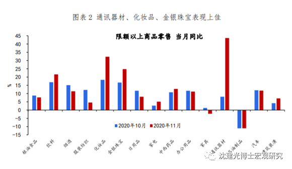 社零繼續(xù)改善,通訊器材、化妝品、金銀珠寶等表現(xiàn)上佳。商品零售方面,可選品亮點(diǎn)不少。分品類看,通訊器材零售增速飆升至44%,主要由于某品牌新款手機(jī)上市;化妝品、金銀珠寶增速分別達(dá)到32%和25%,或與11月購(gòu)物節(jié)促銷活動(dòng)有關(guān);而食品、煙酒、日用品等必須品增速回落。社零驅(qū)動(dòng)力已經(jīng)從前期基本生活類消費(fèi)逐步切換到升級(jí)類消費(fèi)。餐飲收入方面,受近期個(gè)別地區(qū)疫情反復(fù)影響,當(dāng)月同比再度轉(zhuǎn)負(fù)(-0.6%)。此外,限額以下企業(yè)社零增速為0.8%,與限額以上持續(xù)分化,中小零售企業(yè)經(jīng)營(yíng)仍有待恢復(fù)。