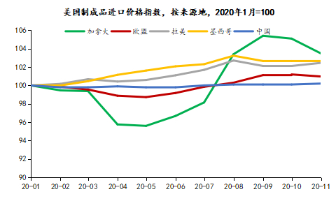 進(jìn)入11月,美國(guó)疫情卷土重來(lái),11、12月月均確診為20萬(wàn)例,是三季度的4—5倍。在此背景下,美國(guó)的防疫用品需求反彈,織物、塑料、醫(yī)療儀器進(jìn)口加速上升;同時(shí),消費(fèi)需求缺口進(jìn)一步擴(kuò)大疊加樓市火熱延續(xù),推動(dòng)上述中國(guó)消費(fèi)品出口全線上升。這也是11月份中國(guó)對(duì)美出口增速“上臺(tái)階”的原因。