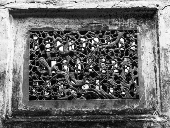 觀魚廳嵌石雕花窗,是雙面鏤空的“四喜(鵲)登梅(花)”。
