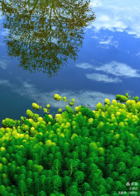 南湖春曉,嫩綠萌動。喚醒一湖春水,飄落滿天白云。