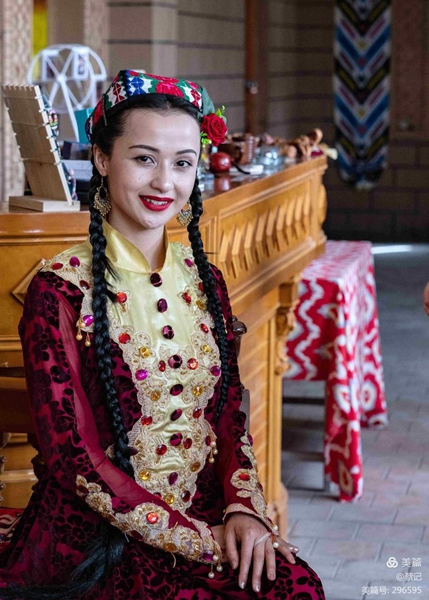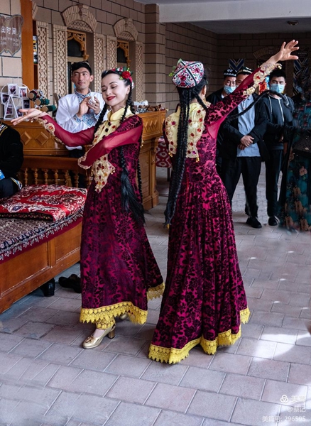 身穿各族鮮艷服飾的大叔和姑娘們手捧水果、馕餅、朵帕(維吾爾族花帽)等特產(chǎn),或是頭頂茶炊用具出場(chǎng),歡迎四方來客。