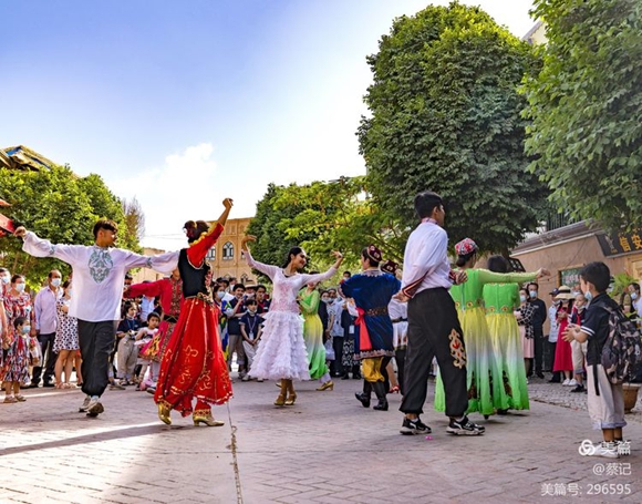 在老城街上,男女青年跳起了輕快靈巧的維吾爾族舞蹈。