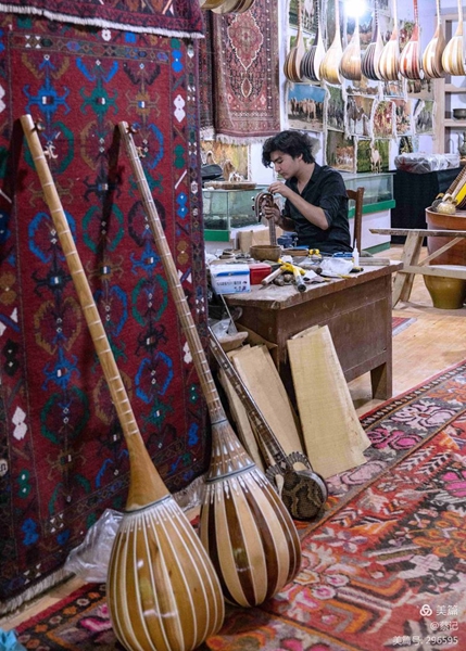 掛在架子上的是“都塔爾”琴,其名字來源于波斯語“dutar”。演奏時(shí)右手五指并用,或撥或挑或掃,琴音聲音雖小但音色卻很柔美,尤其適合于自彈自唱。
