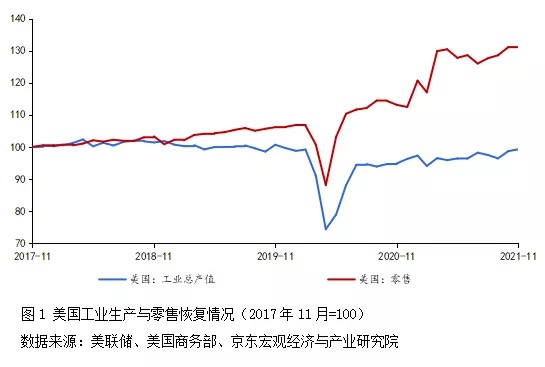 疫情以來(lái)美國(guó)等發(fā)達(dá)經(jīng)濟(jì)體紛紛踐行MMT政策,供給修復(fù)顯著慢于需求。拜登政府大規(guī)模實(shí)施財(cái)政赤字貨幣化,依靠“直升機(jī)撒錢(qián)”強(qiáng)力刺激需求側(cè),對(duì)經(jīng)濟(jì)復(fù)蘇起到了積極作用,但也導(dǎo)致復(fù)蘇結(jié)構(gòu)極不均衡,突出表現(xiàn)為供給側(cè)恢復(fù)滯后(見(jiàn)圖1)。2021年美國(guó)零售超預(yù)期上漲,截至2021年11月已達(dá)到2017年11月水平的131.3%,顯著超過(guò)疫情之前;供給側(cè)恢復(fù)則顯著滯后,在疫情反復(fù)延緩復(fù)工復(fù)產(chǎn)、港口貨物處理能力有限推動(dòng)運(yùn)價(jià)飆升、原材料短缺等因素影響下,制造業(yè)產(chǎn)能始終無(wú)法完全釋放,截至2021年11月美國(guó)工業(yè)總產(chǎn)值仍不及疫情前水平。