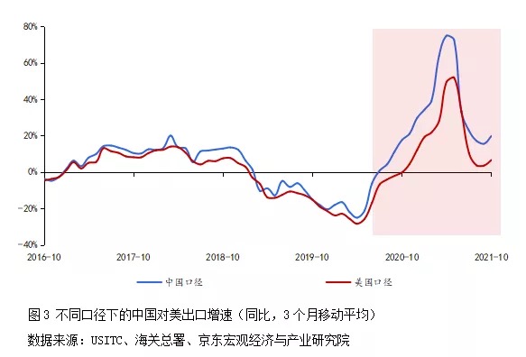 不同應(yīng)對(duì)策略導(dǎo)致中美供需基本面差異,成為推動(dòng)疫情以來(lái)中國(guó)對(duì)美出口高增長(zhǎng)的主因。憑借穩(wěn)定的產(chǎn)業(yè)鏈、供應(yīng)鏈,中國(guó)制造成為美國(guó)填補(bǔ)其商品需求缺口的主要來(lái)源。海關(guān)數(shù)據(jù)顯示,2020年中國(guó)對(duì)美出口逆勢(shì)增長(zhǎng)7.9%,2021年前11個(gè)月累計(jì)同比增長(zhǎng)28.3%,美國(guó)重新成為中國(guó)第一大出口目的地,與中美經(jīng)貿(mào)摩擦期間中國(guó)對(duì)美出口不斷下滑形成鮮明對(duì)比(見(jiàn)圖3)。
