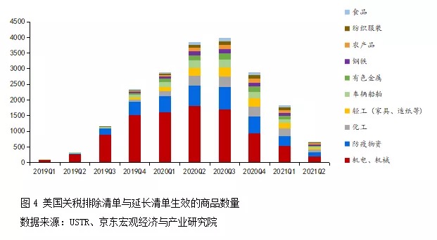 疫情以來(lái)美國(guó)對(duì)中國(guó)制造的依賴(lài),并非加征關(guān)稅等因素可以扭轉(zhuǎn)。中國(guó)海關(guān)數(shù)據(jù)顯示,疫情以來(lái)美國(guó)對(duì)中國(guó)機(jī)電、機(jī)械、中間品等進(jìn)口依賴(lài)度有所提升。2020年前11個(gè)月中國(guó)對(duì)美出口構(gòu)成中,機(jī)電、機(jī)械類(lèi)商品份額高達(dá)43%,塑料橡膠、車(chē)輛船舶、玻璃陶瓷、化工產(chǎn)品等中間品份額較疫情前(2019年)水平均有抬升。美國(guó)對(duì)關(guān)稅排除商品的選擇也印證了這一點(diǎn),2019年至2021年5月美國(guó)陸續(xù)公布33批關(guān)稅排除清單,其中機(jī)電產(chǎn)品、機(jī)械設(shè)備占全部近2000種商品數(shù)量的比重接近一半(見(jiàn)圖4)。美國(guó)國(guó)際貿(mào)易委員會(huì)(USITC)的數(shù)據(jù)測(cè)算結(jié)果顯示,2020年以來(lái)中國(guó)4批關(guān)稅清單商品對(duì)美出口金額均顯著修復(fù),加征關(guān)稅對(duì)中國(guó)出口的影響已大幅降低。