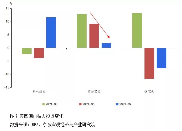 二是生產(chǎn)端修復(fù)仍然滯后。2021年12月美國(guó)制造業(yè)產(chǎn)能利用率剛剛接近疫情前水平(見(jiàn)圖6),但近期奧密克戎新毒株已開(kāi)始大流行,疊加勞動(dòng)率短缺,為復(fù)工復(fù)產(chǎn)再次帶來(lái)不確定性。原材料漲價(jià)正持續(xù)壓縮下游行業(yè)利潤(rùn),美股2021年三季報(bào)數(shù)據(jù)顯示,能源、金屬等大宗價(jià)格大幅抬升之下,原材料、公用事業(yè)(電力等)等行業(yè)凈資產(chǎn)收益率(ROE)水平較疫情前明顯提升,下游工業(yè)、消費(fèi)品行業(yè)的利潤(rùn)空間被明顯打壓。制造業(yè)投資也處于低位,2021年三季度末,反映企業(yè)投資狀況的非住宅類(lèi)固定資產(chǎn)投資環(huán)比折年率僅為1.8%(見(jiàn)圖7),較上期大幅下滑,投資恢復(fù)緩慢對(duì)制造業(yè)擴(kuò)大產(chǎn)能形成制約。此外,全球缺芯仍將拖累汽車(chē)產(chǎn)業(yè)鏈。國(guó)際半導(dǎo)體產(chǎn)業(yè)協(xié)會(huì)(SEMI)和國(guó)際信息技術(shù)服務(wù)公司Gartner的數(shù)據(jù)顯示,截至2021年第四季度,全球晶圓廠產(chǎn)能利用率已達(dá)到92%,接近飽和,芯片擴(kuò)產(chǎn)能周期在1—2年左右,本輪芯片短缺可能持續(xù)至2022年第二季度。