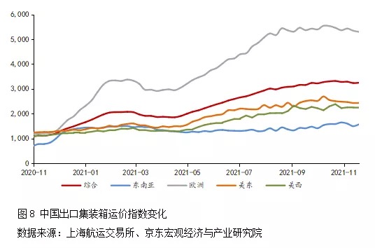 三是運(yùn)輸瓶頸解決仍須時(shí)日。國(guó)際運(yùn)輸方面,長(zhǎng)灘港和洛杉磯港合計(jì)約占美國(guó)海運(yùn)集裝箱吞吐量的40%,但疫情以來(lái)上述兩個(gè)港口運(yùn)營(yíng)效率低下,2021年11月洛杉磯港出口空箱比仍高達(dá)77%,平均輪班在港時(shí)間依然超10天;受此影響2021年以來(lái)美西航線與美東航線的中國(guó)出口集裝箱運(yùn)價(jià)指數(shù)價(jià)格(CCFI)持續(xù)高位運(yùn)行(見(jiàn)圖8)。國(guó)內(nèi)運(yùn)輸方面,根據(jù)美國(guó)卡車(chē)運(yùn)輸協(xié)會(huì)2021年11月預(yù)測(cè),當(dāng)前美國(guó)卡車(chē)司機(jī)欠缺數(shù)量比新冠疫情前增加了30%,缺口達(dá)8萬(wàn)人,司機(jī)短缺也制約運(yùn)輸瓶頸的解決。