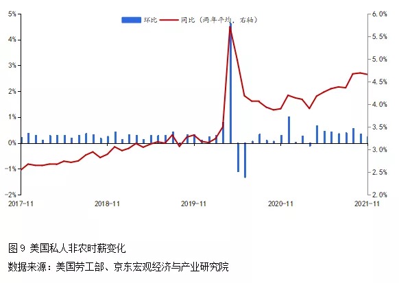 六大因素將推動(dòng)美國(guó)通脹繼續(xù)保持高位。一是歐美貨幣政策正常化進(jìn)程滯后,極度寬松的貨幣政策仍將持續(xù)。二是產(chǎn)出缺口仍然存在,供不應(yīng)求引發(fā)價(jià)格上漲壓力,供需方面的不匹配短期之內(nèi)難以緩解。三是工資上漲過(guò)快。在勞動(dòng)力短缺之下,2021年11月美國(guó)私人非農(nóng)時(shí)薪兩年平均同比增長(zhǎng)4.7%(見(jiàn)圖9),其中休閑酒店業(yè)、專(zhuān)業(yè)商業(yè)服務(wù)、倉(cāng)儲(chǔ)運(yùn)輸?shù)刃袠I(yè)漲幅排名靠前。四是能源短缺。全球推動(dòng)碳中和戰(zhàn)略導(dǎo)致供需矛盾,決定了能源價(jià)格在相當(dāng)長(zhǎng)的時(shí)期內(nèi)仍有動(dòng)力保持高位,美國(guó)2021年11月CPI能源分項(xiàng)大幅走高,同比上漲33%。五是美國(guó)樓市熱度較高。房貸利率寬松、居民部門(mén)杠桿率不高、補(bǔ)庫(kù)存需求旺盛和企業(yè)樂(lè)觀預(yù)期,將共同支撐2022年美國(guó)房?jī)r(jià)與房租保持在較高水平。六是輸入性通脹。疫情暴發(fā)后,美國(guó)自各經(jīng)濟(jì)體進(jìn)口制成品價(jià)格明顯攀升;與2020年初相比,當(dāng)前各經(jīng)濟(jì)體制成品價(jià)格大多漲幅在3%—8%之間,其中加拿大更是上漲15%。