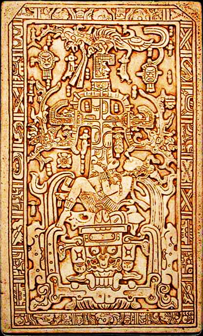 1950年代在王宮遺址發(fā)現(xiàn)墓室。石棺上一塊厚石板通體淺浮雕裝飾,鐫刻的是已故國王巴加爾(Pacal,603~683年)正往地怪的大口內(nèi)跌落。骷髏頭表示地府,是死者和黑夜太陽的棲息地。骷髏頭上一棵宇宙之樹。身子蜷曲的兩條蛇象征著天,棲息樹上的鳥代表太陽。