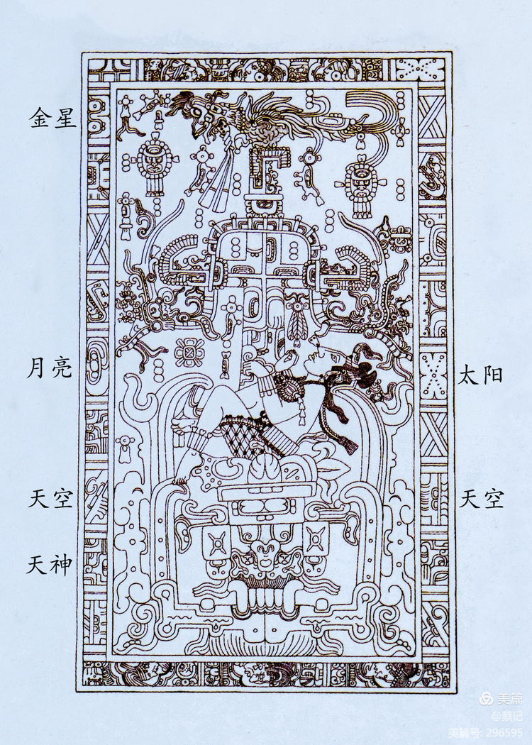 由圖案連接組成的邊框代表宇宙,可辨別出金星、月亮、天空、天神、太陽等和瑪雅文字相似的圖形符號。