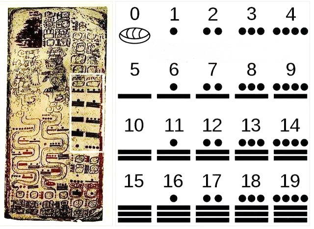 瑪雅人使用三個記數(shù)符號。一個圓點(diǎn)表示“1”,兩個圓點(diǎn)表示“2”;貝殼表示“0”;橫杠“—”表示“5”。每數(shù)位的最大值為19,即三條橫杠加4個圓點(diǎn)。