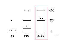 見下圖右第一列。上邊第一行:橫杠表示5,數(shù)值為2000(5×400)。第二行:橫杠加2個圓點(diǎn)表示7,數(shù)值為140(7×20)。第三行:橫杠表示5,數(shù)值為5(5×1)。該列的數(shù)值為2145(2000+140+5)。