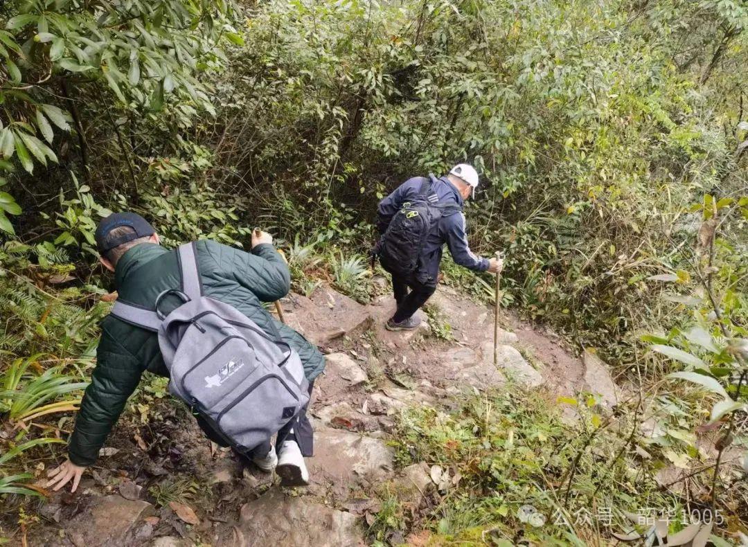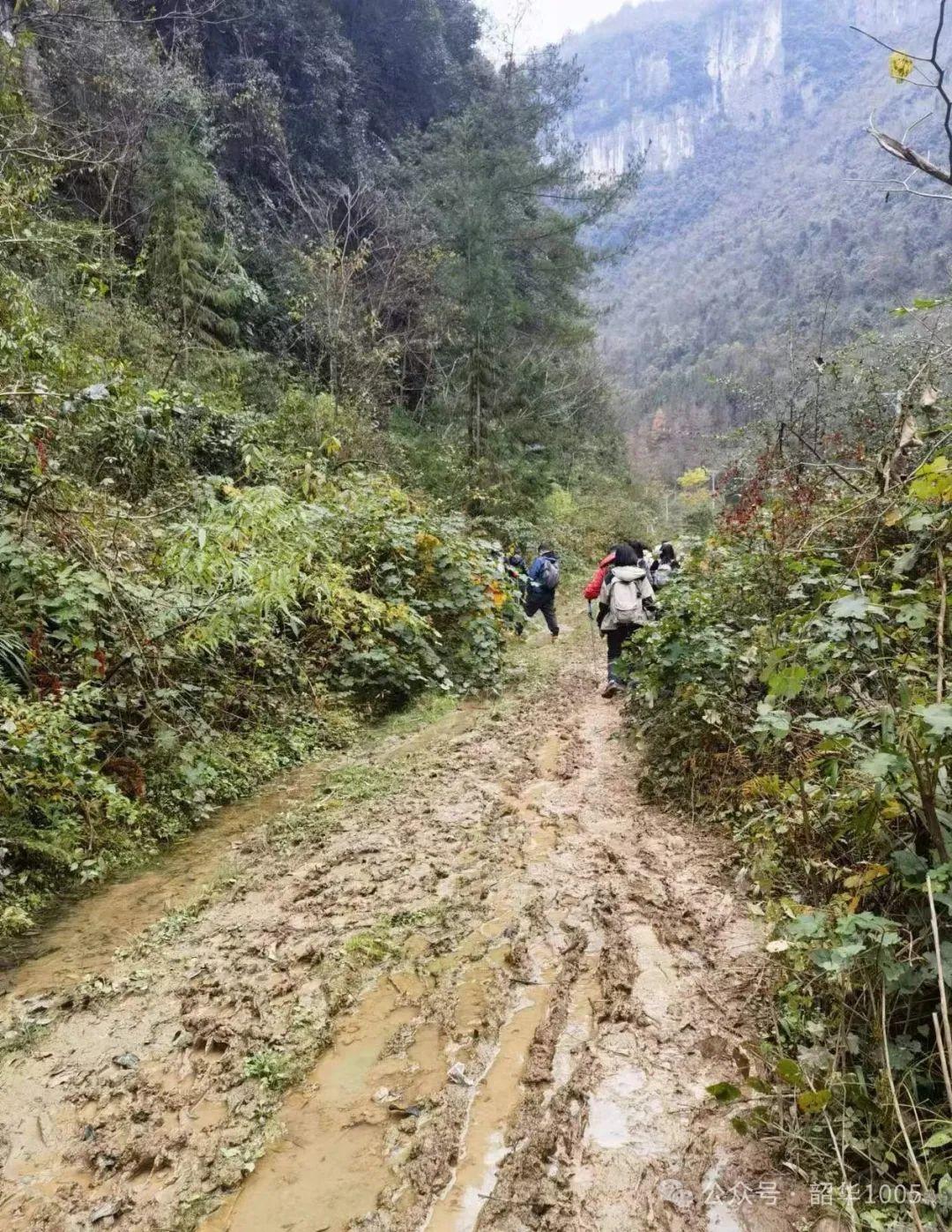 從入口處開始,我們便走上了一條僅容一人行走的煉獄級崎嶇山路,可能是剛下過雨的緣故,“之”字形羊腸小徑迂回曲折、泥濘坑洼,滿是泥槳水坑。我們不得不彎腰、低頭、側身,竹棍開路,左躲右閃,小心翼翼地邁腿抬腳慢慢地一步步往下探,深一腳淺一腳,此時什么風景都是“浮云”,安全才是第一!