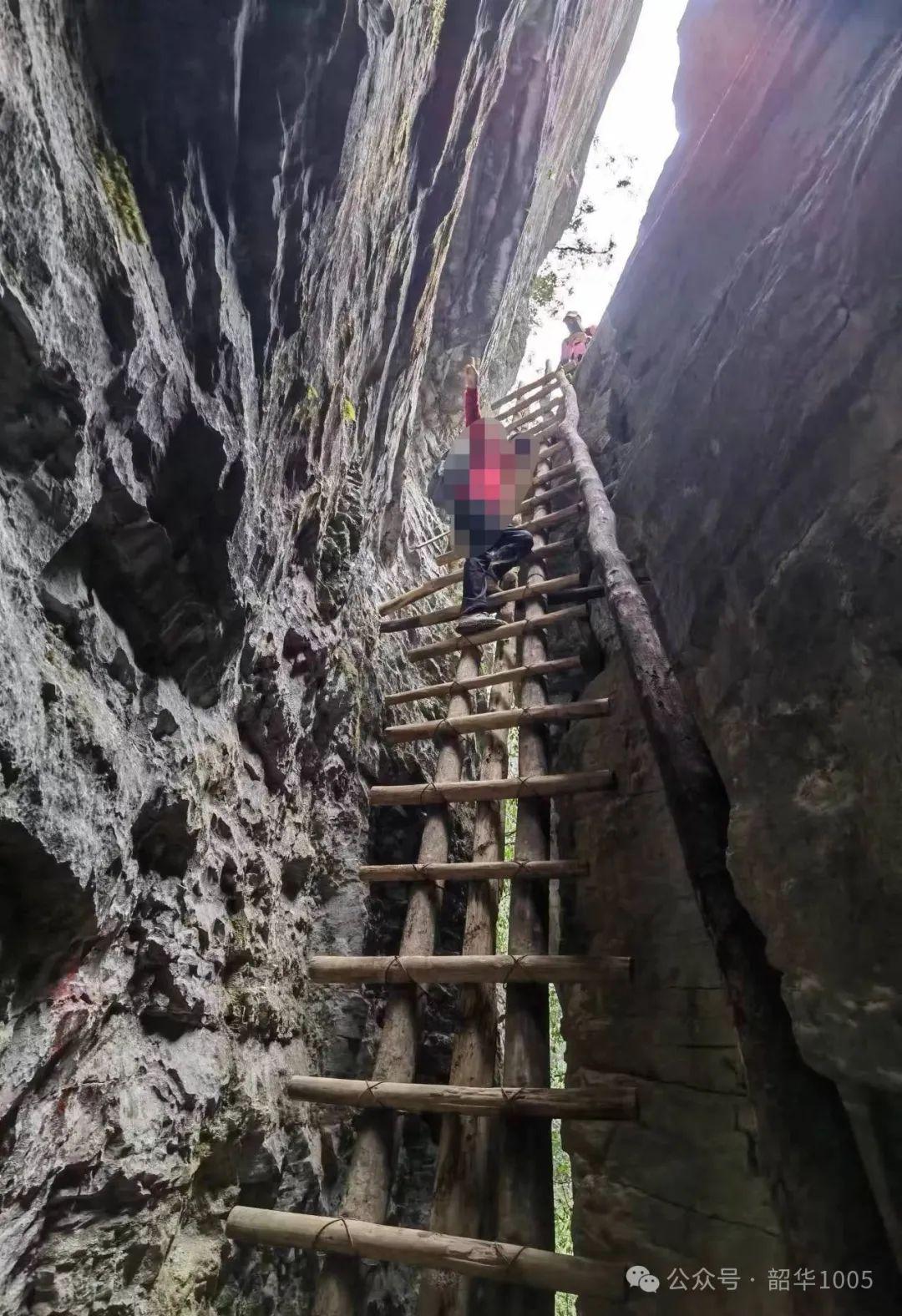 爬完好漢坡之后全程“輕舟已過萬重山”,將到達此行的最后一站——一線天。一線天是條直上直下的天然地縫,只有一架簡陋的木梯子卡在巖縫里,勉強能容一個人上下,“驢友們”均是靠這把梯子才能走出清江古河床,我們自然不能例外!
