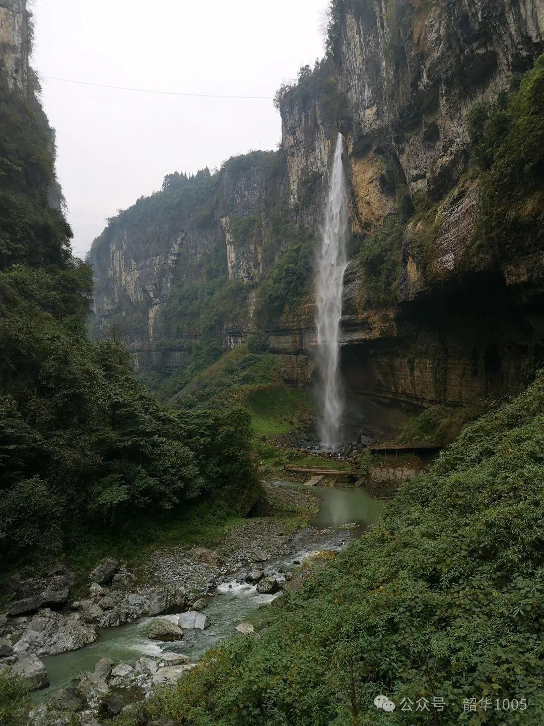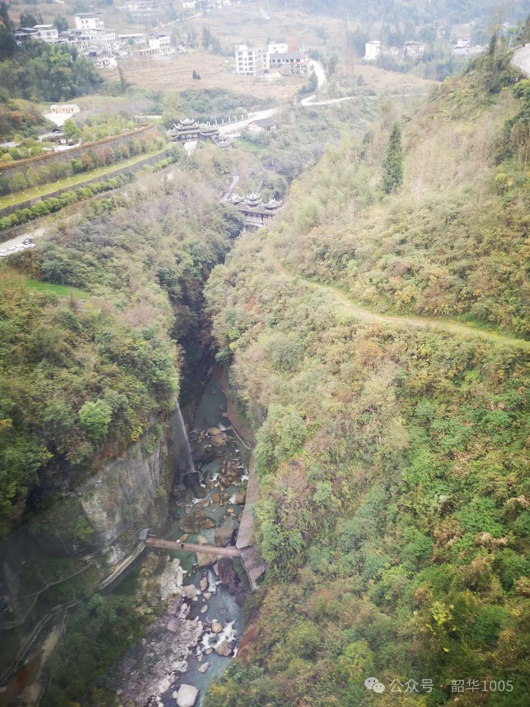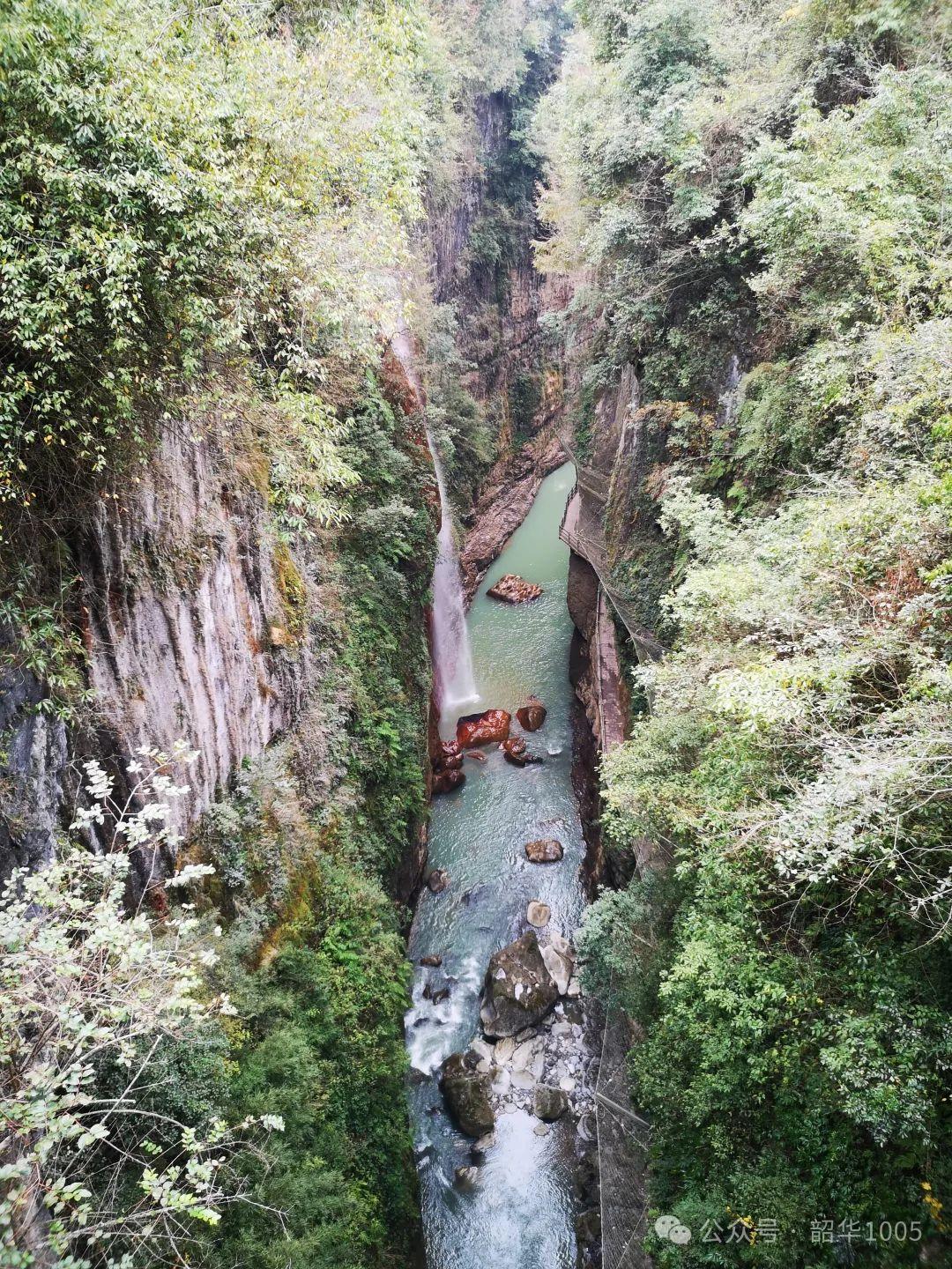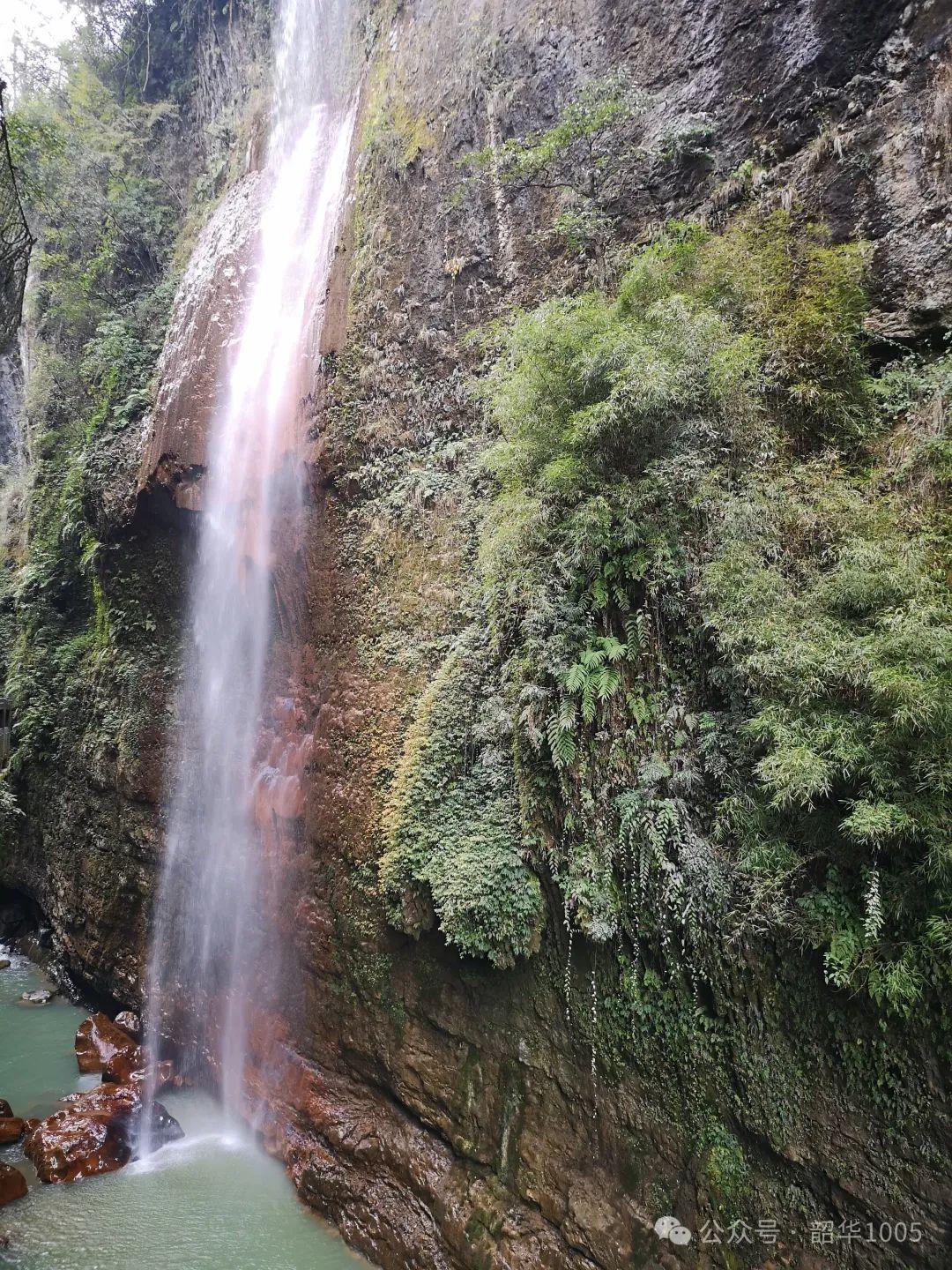 也許是天公作美,我們沿著侗族風(fēng)格的風(fēng)雨廊橋行走在峽谷非常輕松,愜意滿滿!地縫兩旁樹木茂盛,遮天蔽日,谷底濃濃的水霧并不讓人覺得陰冷,反而在冬日暖陽的照射下還有絲絲的暖意。抬頭仰望,地縫宛如天開一線,兩邊巖壁條塊分明如斧劈刀削,深壑幽長險峻,怪石密布,碧水潺潺,五彩黃龍瀑布、彩虹瀑布、 云龍瀑布、沐撫飛瀑等飛花濺玉,如漫如紗懸掛在絕壁之上,飛流直下,在陽光中閃現(xiàn)出一道道絢麗斑斕的彩虹飄掛在地縫中,令人眼花繚亂!