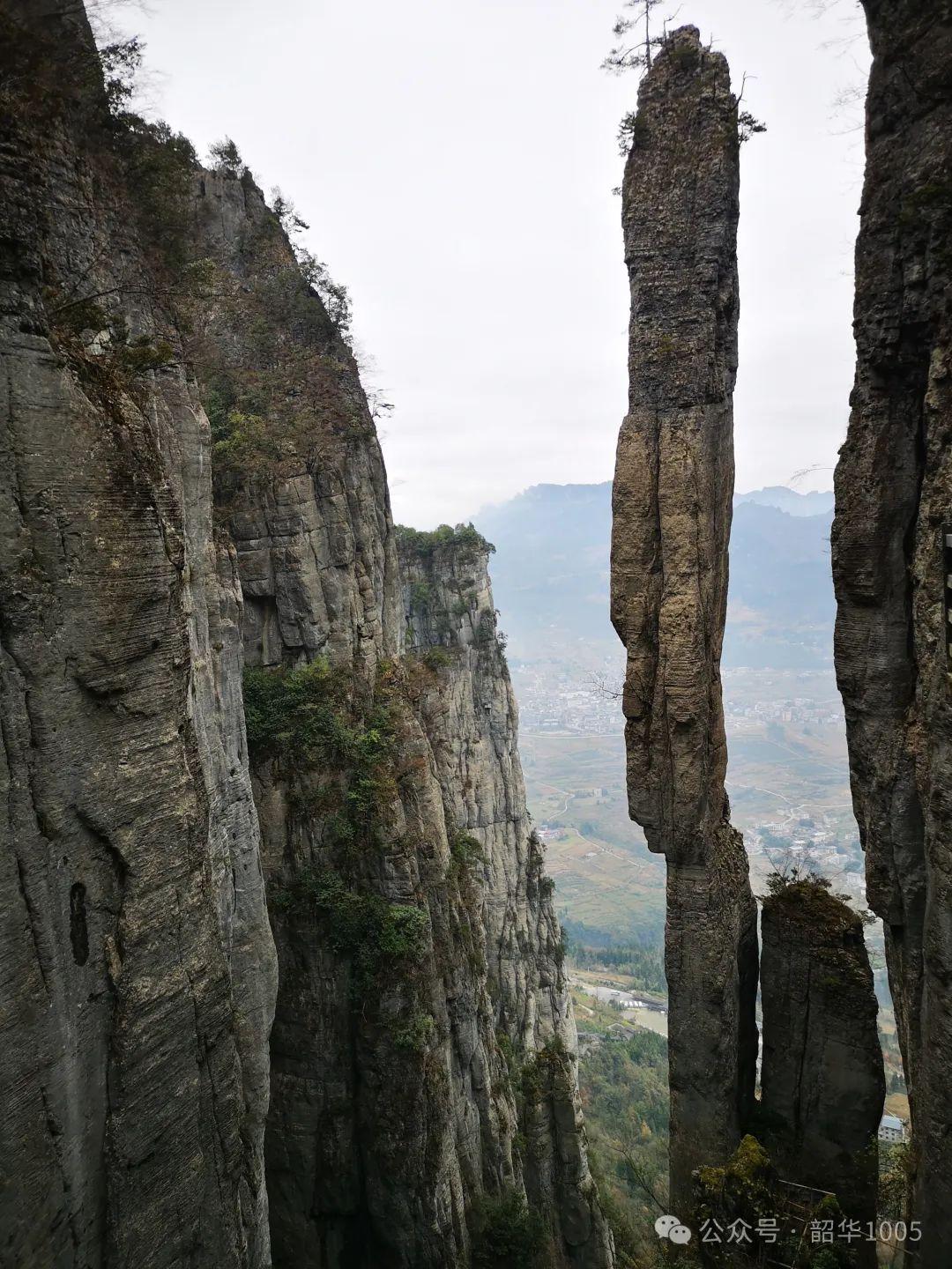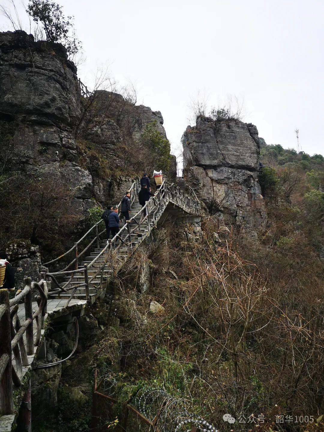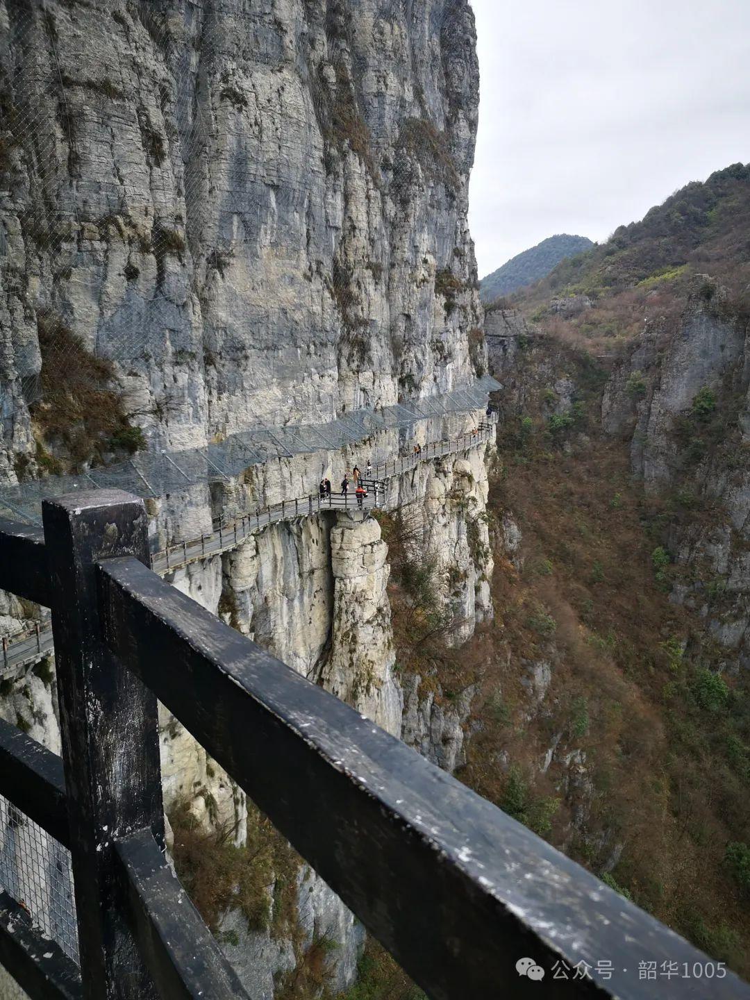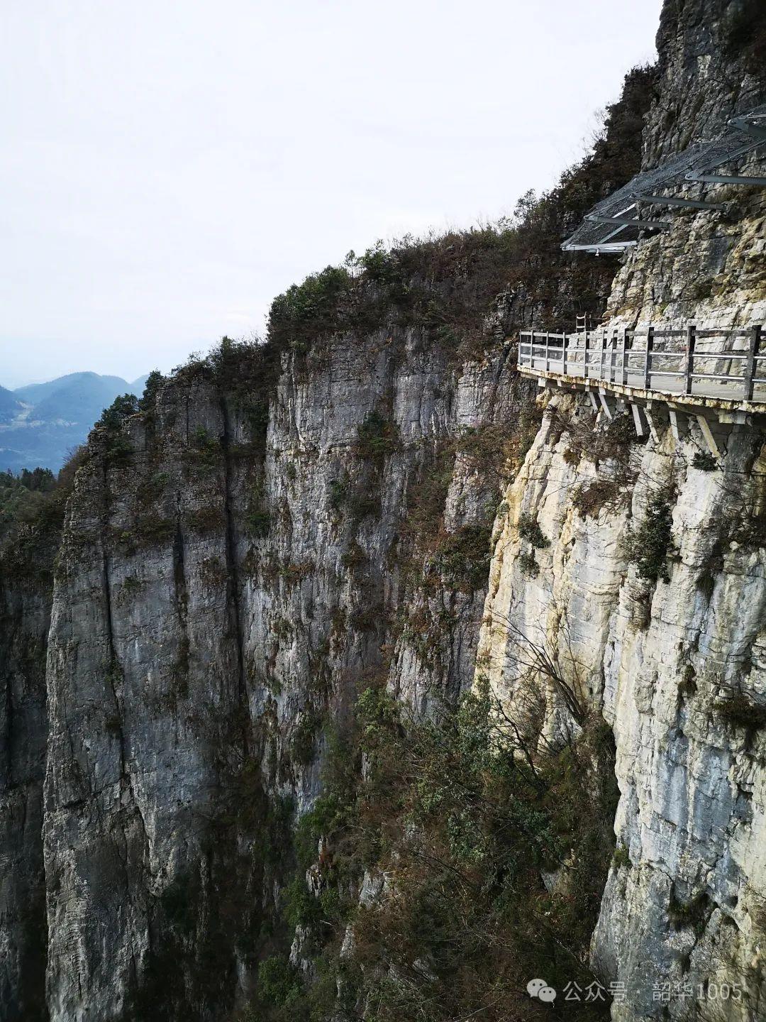 行走七星寨的確挺累人的,但對于我們?nèi)痪媒?jīng)考驗的“驢友”,七星寨談不上挑戰(zhàn)!走著、說著、笑著、照著,不知不覺中便走到了絕壁棧道,這是七星寨的主要景點之一,全長488米,海拔1700米、高差300米、七彎八拐118級石階。之所以稱為“絕壁棧道”,皆因棧道挑空橫出絕壁,一邊是千丈絕壁,另邊是萬丈深淵,懸空環(huán)山,蜿蜒曲折,像一條玉帶環(huán)繞在崇山絕壁之中……如果沒有恐高癥,這里絕對是觀景的最佳去處。你不妨想象一下站在高山絕壁之上,那種“手可摘星辰、欲與天公試比高、會當(dāng)凌絕頂,一覽眾山小”的氣勢是多么令人激動!憑欄遠(yuǎn)眺,峽谷遠(yuǎn)近美景一覽無余,云海絕壁,藍(lán)天白云下田野阡陌縱橫交錯、土家族村寨星星點點,一望無際的原野郁郁蔥蔥,群峰綿延若隱若現(xiàn)……冷峻驚險奇美,我們仿佛置身于壯闊純美、盎然雅趣的秘境之中!